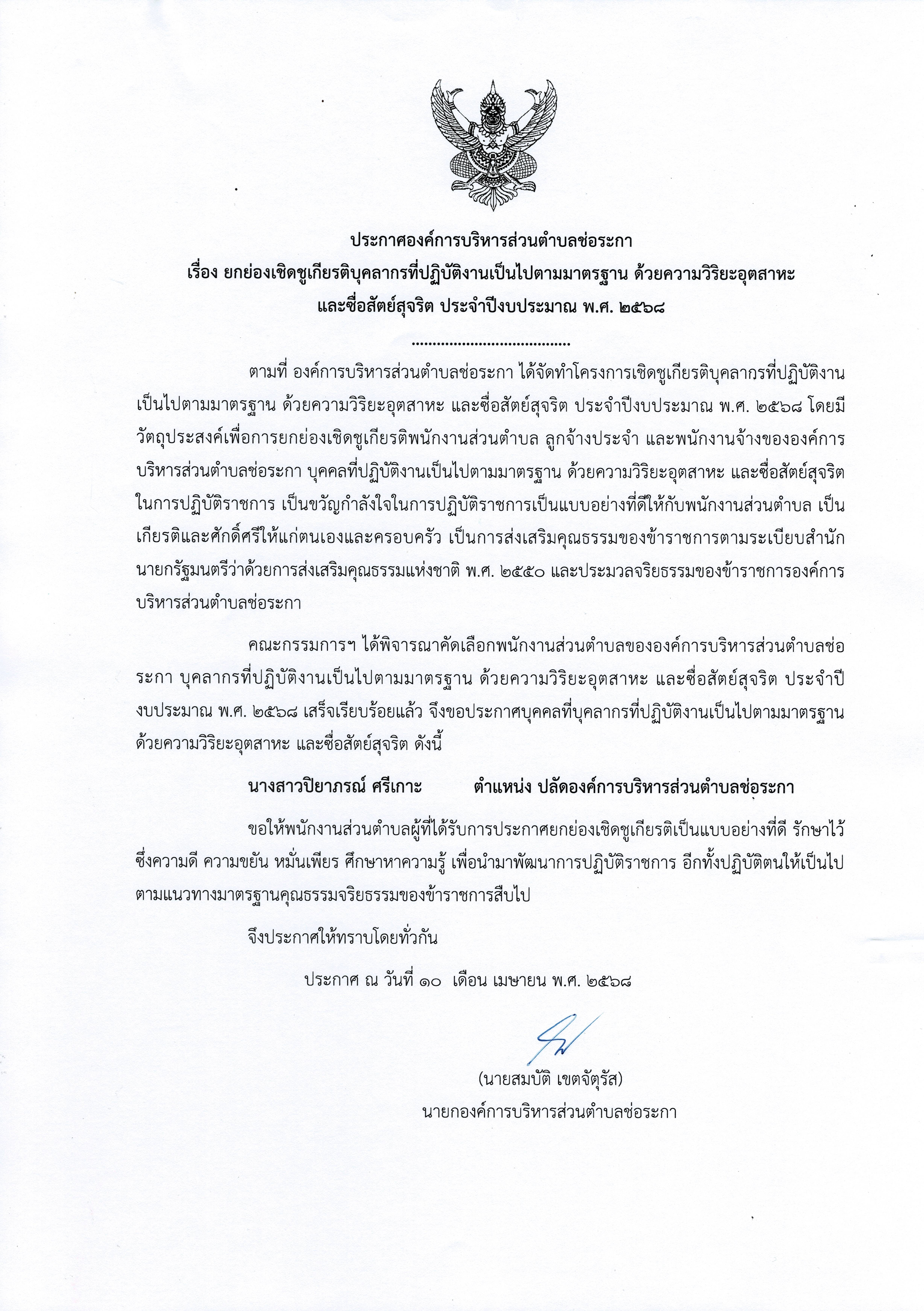 องค์การบริหารส่วนตำบลช่อระกา ได้จัดทำโครงการเชิดชูเกียรติบุคลากรที่ปฏิบัติงานเป็นไปตามมาตรฐานด้วยความวิริยะอุตสาหะ และซื่อสัตย์สุจริต ประจำปีงบประมาณ พ.ศ. 2568 โดยมีวัตถุประสงค์เพื่อการยกย่องเชิดชูเกียรติพนักงานส่วนตำบล ลูกจ้างประจำ และพนักงานจ้างขององค์การบริหารส่วนตำบลช่อระกา บุคคลที่ปฏิบัติงานเป็นไปตามมาตรฐานด้วยความวิริยะอุตสาหะ และซื่อสัตย์สุจริตในการปฏิบัติราชการ เป็นขวัญกำลังใจในการปฏิบัติราชการเป็นแบบอย่างที่ดีให้กับพนักงานส่วนตำบล เป็นเกียรติและศักดิ์ศรีให้แก่ตนเองและครอบครัว เป็นการส่งเสริมคุณธรรมของข้าราชการตามระเบียบสำนักนายกรัฐมนตรีว่าด้วยการส่งเสริมคุณธรรมแห่งชาติ พ.ศ. 2550 และประมวลจริยธรรมของข้าราชการองค์การบริหารส่วนตำบลช่อระกา คณะกรรมการฯ ได้พิจารณาคัดเลือกพนักงานส่วนตำบลขององค์การบริหารส่วนตำบลช่อระกา บุคลากรที่ปฏิบัติงานเป็นไปตามมาตรฐานด้วยความวิริยะอุตสาหะ และซื่อสัตย์สุจริต ประจำปีงบประมาณ พ.ศ. 2568 เสร็จเรียบร้อยแล้ว จึงขอประกาศบุคคลที่บุคลากรที่ปฏิบัติงานเป็นไปตามมาตรฐานด้วยความวิริยะอุตสาหะ และซื่อสัตย์สุจริต ได้แก่ นางสาวปิยาภรณ์ ศรีเกาะ ตำแหน่ง ปลัดองค์การบริหารส่วนตำบลช่อระกา