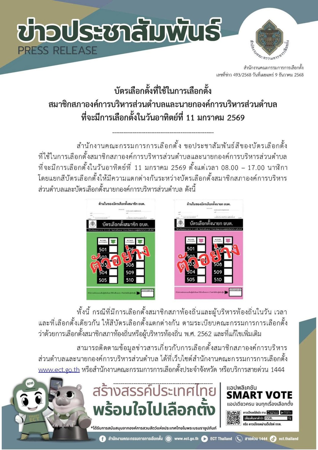 สำนักงานคณะกรรมการการเลือกตั้ง ประชาสัมพันธ์สีของบัตรเลือกตั้งที่ใช้ในการเลือกตั้งสมาชิกสภาองค์การบริหารส่วนตำบลและนายกองค์การบริหารส่วนตำบล ที่จะมีการเลือกตั้งในวันอาทิตย์ที่ 11 มกราคม 2569 ตั้งแต่เวลา 08.00 - 17.00 นาฬิกา
